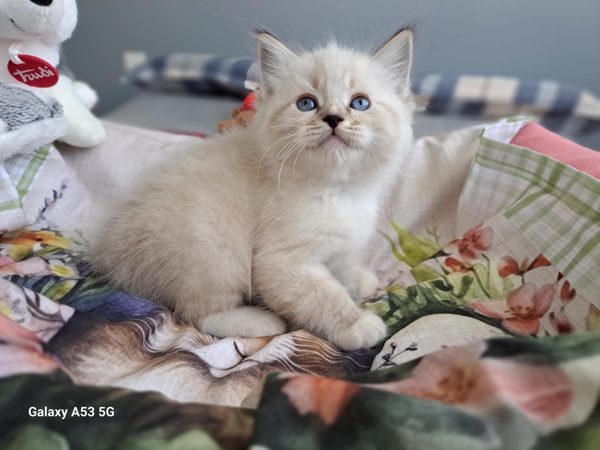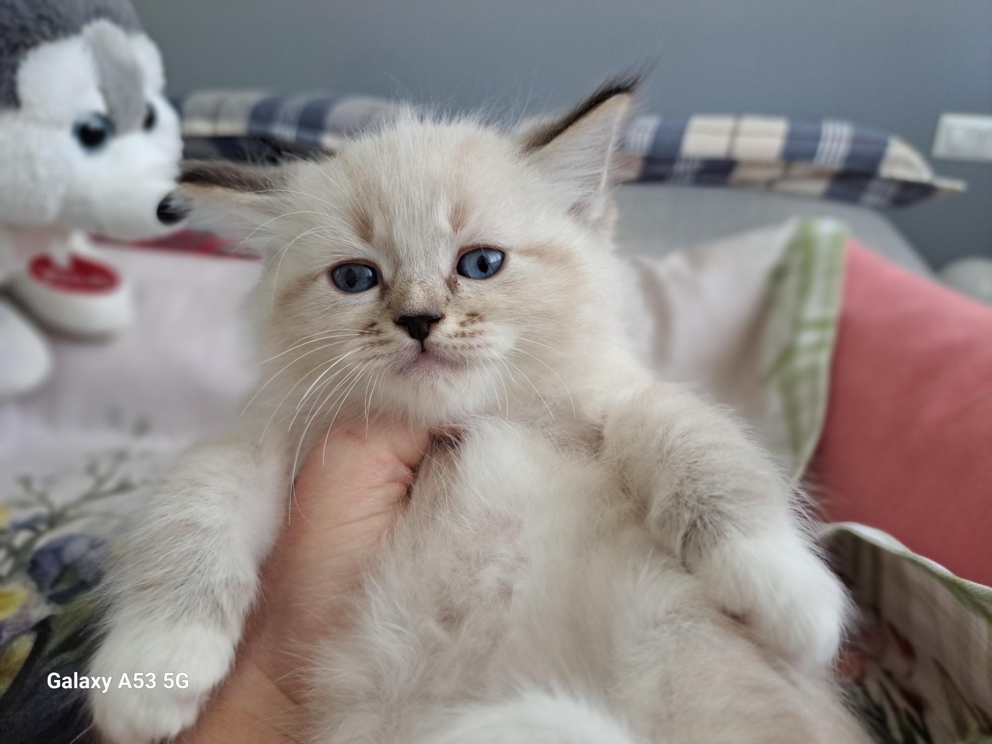 Sweet, beautiful, and incredibly charming seal tabby point mitted kitten. Excellent physical structure, beautiful morphology, good markings, and a semi-long, dense, silky coat, with a very long and full tail. A lovely little white blaze highlights this kitten’s nose. WhiteAngels Sparrow adores physical contact and cuddles. He is offered as a “SHOW-NEUTER” kitten, meaning he has show potential but is intended to be neutered once he reaches adulthood.